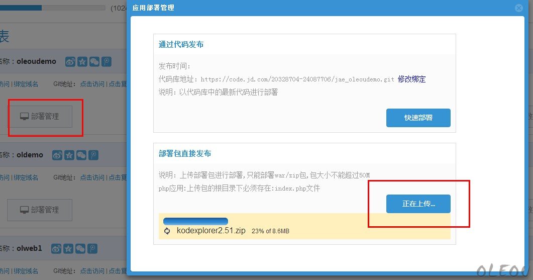 开始部署:管理部署—上传包部署(找到要上传的kodexplorer2.5.zip)